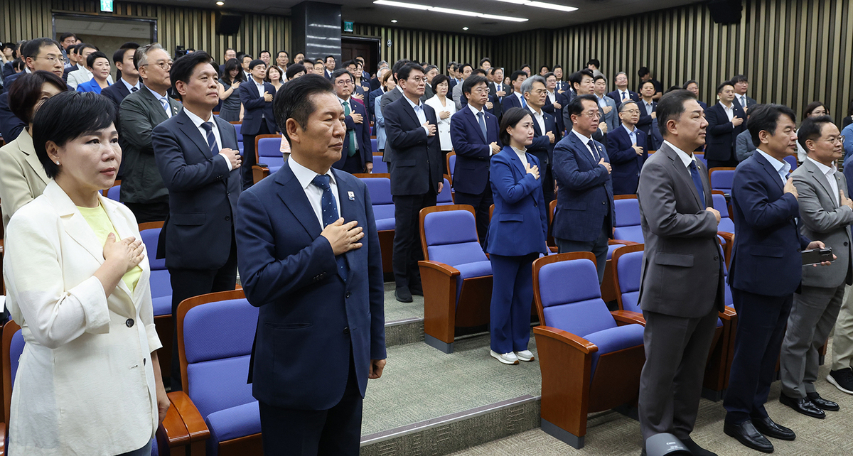 더불어민주당 정청래 대표(앞줄 왼쪽 두 번째)가 3일 서울 여의도 국회에서 열린 정책의원총회에서 당 소속 의원들과 함께 국기에 대한 경례를 하고 있다.