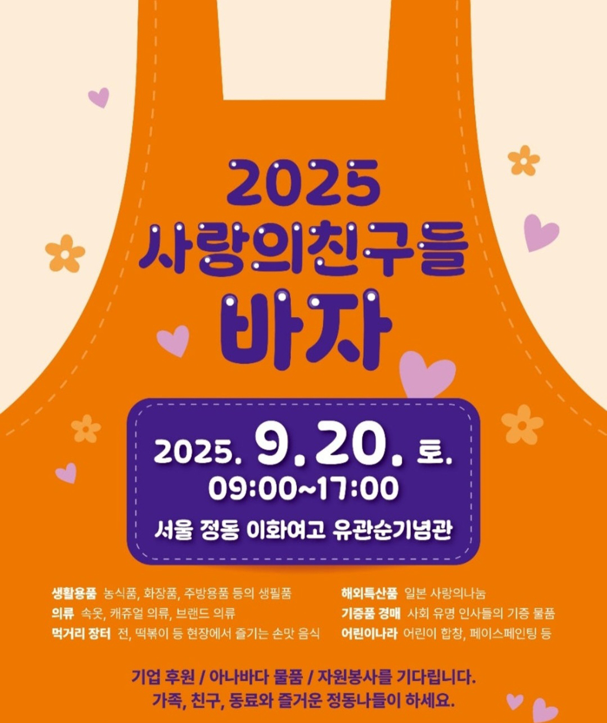 바자에서는 의류, 생활용품을 저렴한 가격에 살 수 있고, 아나바다 장터와 먹거리 장터도 선보인다. 제철 농산물과 지역 특산품을 한자리에서 만나볼 수 있는 특산품 코너도 준비돼 있다. 일본에 거주하는 한국인이 ‘일본 사랑의나눔’을 통해 직접 가져온 물품도 판매된다.
