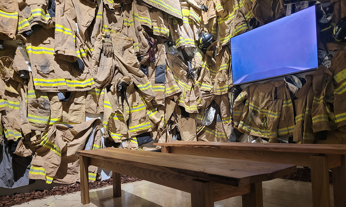 홍림회 소속작가 82명은 지난 3월 경북 의성 산불을 작품으로 표현했다. 산불에 탄 갈라진 나뭇결을 살려 재구성한 의자는 불에 타오른 흔적으로 당시를 속삭인다. 오준식 홍림회장은 “대형 산불이 덮친 천년고찰 고운사의 잔해에서 시작해 지팡이라는 인간을 위한 도구를 만들었다”며 “자연의 재료를 다루는 공예의 본질을 되묻고 환경과 함께 지켜야 할 공동의 가치에 대해 생각한다”고 전했다.