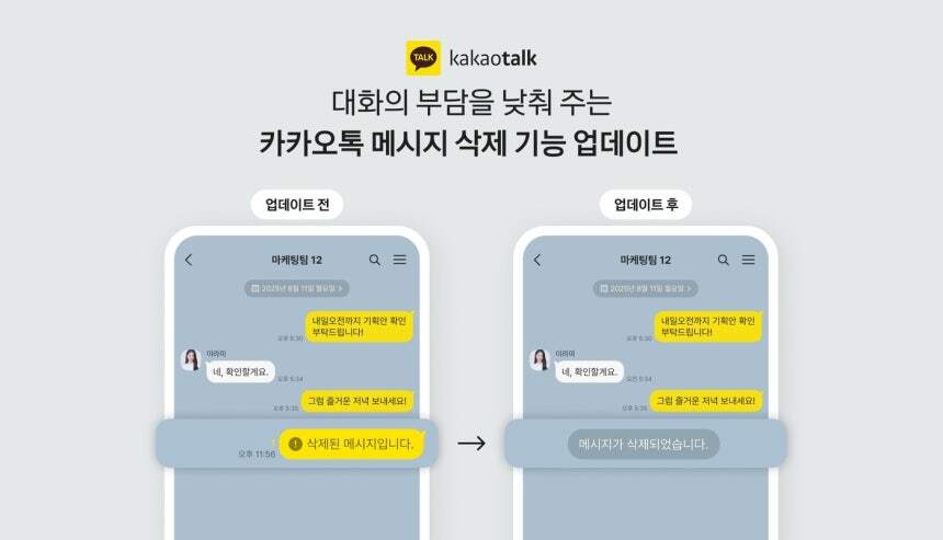 카카오 관계자는 “대화 부담감을 낮추고 원활한 소통 환경을 조성하기 위해 메시지 삭제 기능을 대폭 개선했다”고 말했다.
