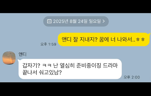 공개된 메시지 대화에서 김동완은 “잘 지내냐. 꿈에 너 나와서”라고 먼저 안부를 전했고, 앤디는 “갑자기? 난 열심히 준비 중이다. 드라마 끝나서 쉬고 있냐”고 근황을 전하며 답했다. 며칠 뒤, 이번에는 앤디가 “뭔 일 없냐. 꿈에 형이 나왔다”고 메시지를 보냈고, 김동완은 “얼른 보자. 왜 서로 꿈꾸냐”라며 남다른 우정을 드러냈다.