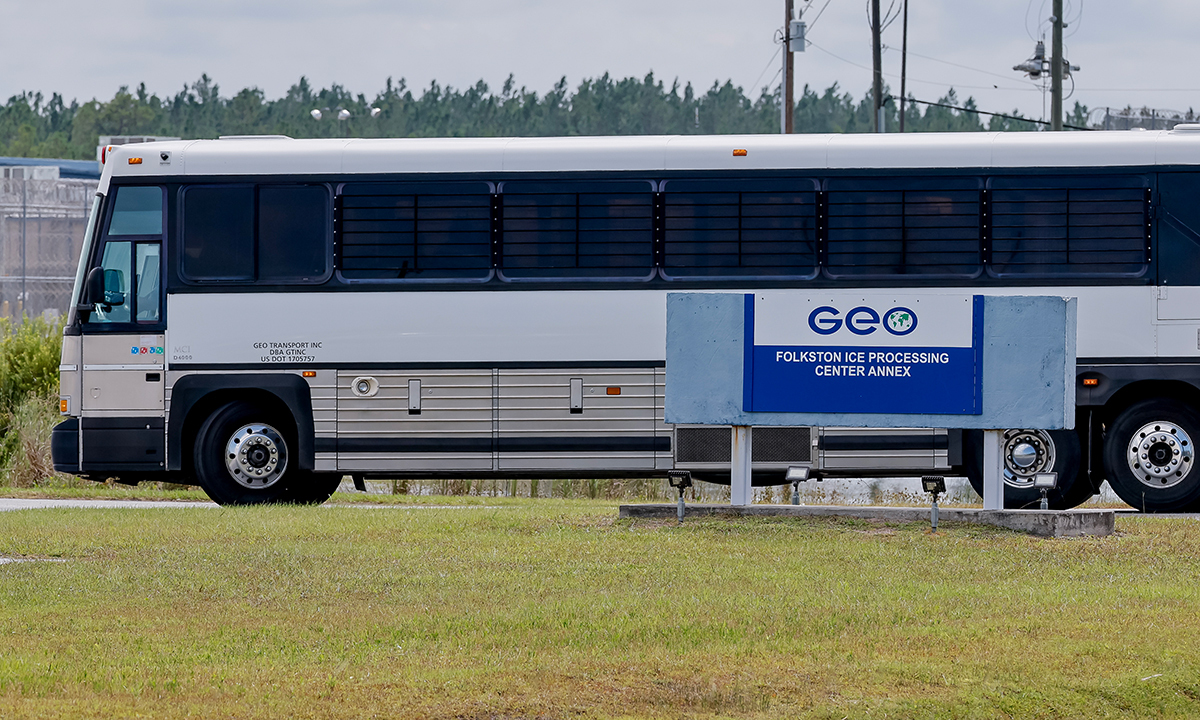 9일(현지시간) 미국 조지아주 포크스턴에 위치한 ICE(미 이민세관단속국) 불법체류자 구금시설과 디레이 제임스 교정시설에 교도소 수송 버스가 도착하고 있다. ICE에 의해 구금된 한국인 300여명 대부분은 디레이 제임스 교정시설에 수감 중이다. 이들을 태우기 위한 전세기가 미국으로 향했으나 귀국은 예정보다 늦어질 전망이다.