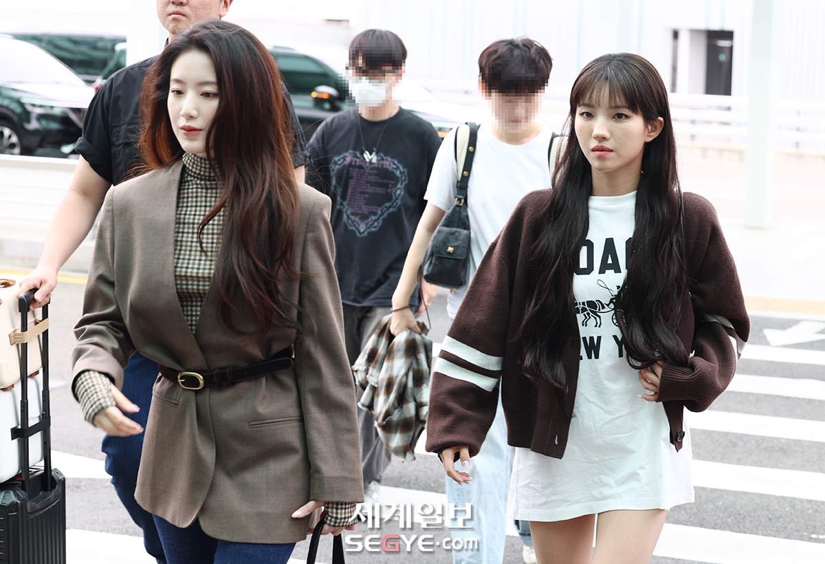 그룹 아이들 슈화(사진 왼쪽)와 소연이 싱가포르에서 열리는 버블링 보일링 뮤직&아트 페스티벌 일정을 위해 12일 인천국제공항을 통해 출국하고 있다.