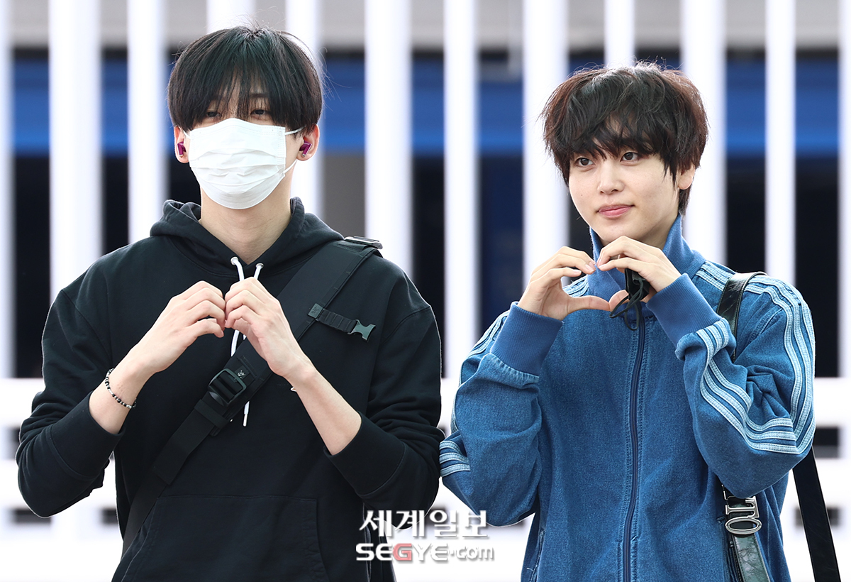 그룹 크래비티 정모(사진 왼쪽)와 형준이 12일 오후 해외 일정 차 인천국제공항을 통해 출국하고 있다.
