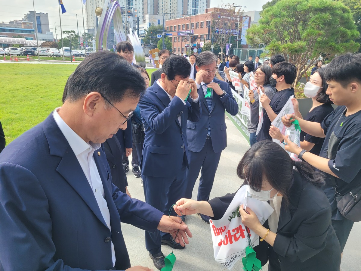 국회 행정안전위원회 15일 오송 참사 국정조사 현장조사에 이어 충북도청 현장질의, 유가족 간담회 등을 이어갔다. 유가족협의회 등은 현장질의가 있는 도의회 앞 광장에서 의원들에게 녹색 리본을 전달하며 오송 참사 진실규명과 책임자 처벌을 촉구했다.