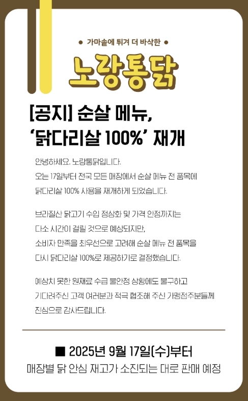 노랑통닭 관계자는 “예상치 못한 원재료 수급 불안정 상황에도 불구하고 기다려주신 고객 여러분과 적극 협조해 주신 가맹점주분들께 진심으로 감사드린다”며 “일관된 품질과 서비스 제공을 위해 원자재 공급망의 안정성을 한층 강화하고 향후 리스크 관리 체계를 고도화해 나가겠다”고 말했다.