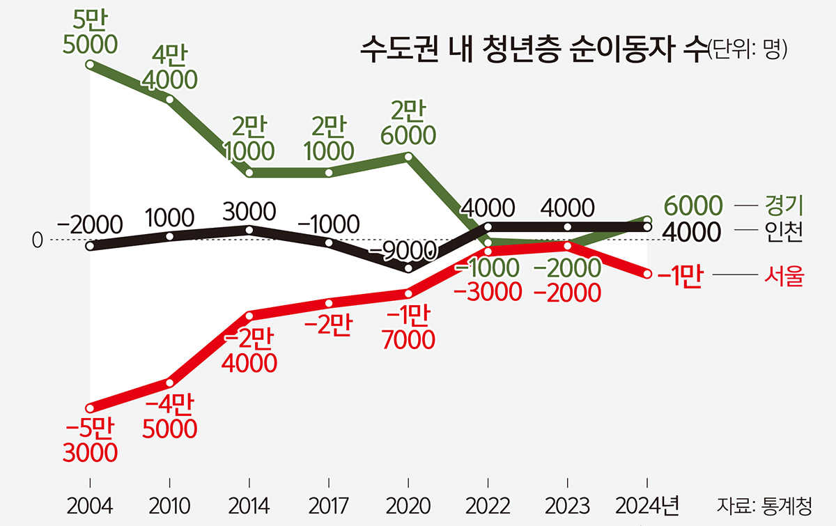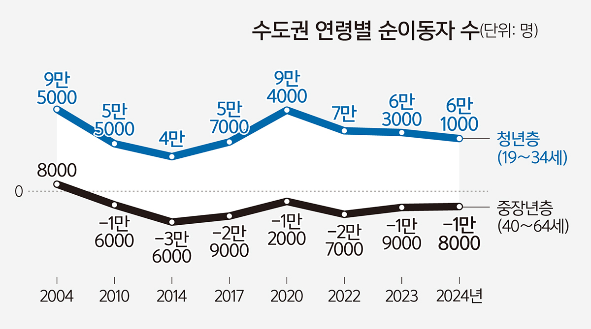 세대별로 보면 청년층은 수도권으로 순유입되는 반면 중장년층은 탈(脫)수도권 추세가 이어지고 있다. 2014년 4만명이던 수도권 유입 청년 수는 지속적으로 증가해 2020년 9만4000명으로 정점을 찍은 뒤, 점차 감소해 지난해 6만1000명으로 줄었다. 저출산에 따라 줄어든 청년 인구를 고려하면 여전히 청년층의 수도권 유입세가 강하다고 볼 수 있다.