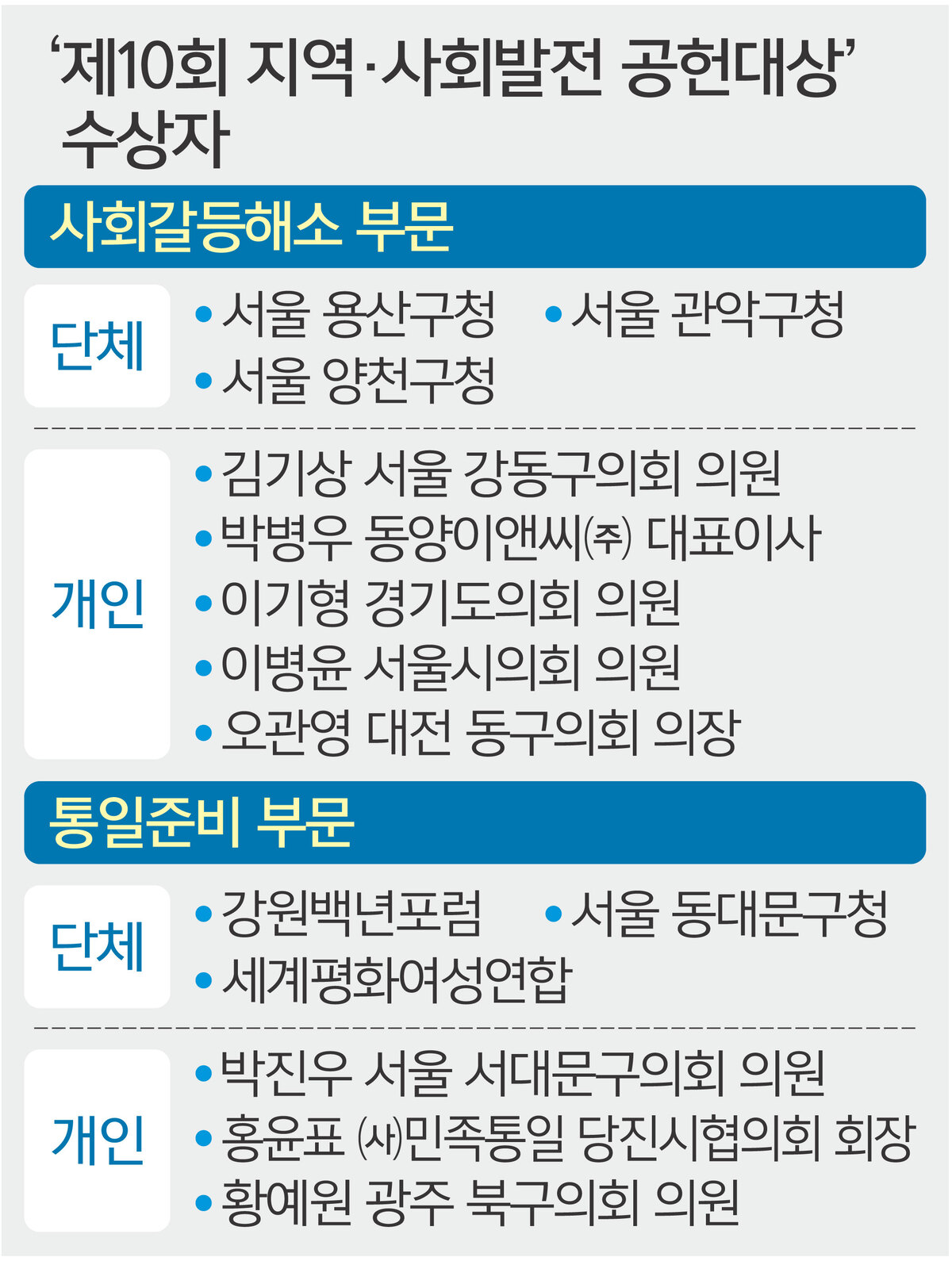 개인상 수상자는 박병우 동양이앤씨㈜ 대표이사, 김기상 서울 강동구의회 의원, 이기형 경기도의회 의원, 이병윤 서울시의회 의원, 오관영 대전 동구의회 의장이다. 박 대표이사는 통합신공항 대구시민추진단을 조직해 K2군사비행장 이전 확정을 이끌어내며 지역 발전의 기초를 마련했다는 평가를 받았다. 김 의원은 둔촌주공 재건축 갈등 현안에서 주민·행정·시공사 간 협의를 주도하며 불안 해소에 앞장섰다. 이기형 의원은 경기도의회에서 김포시의 교육·문화 격차 해소를 위한 정책적 노력을 지속해 왔다. 이병윤 의원은 서울시의회 교통위원장으로 한강버스·위례선 건설, 진접차량기지 등 사안에 대한 안전대책과 연계교통 확충에 기여했다. 오 의장은 자치구의회 의장협의회 회장으로서 중앙과 지방 간 소통을 통해 지방자치 발전을 도모하고 있다.