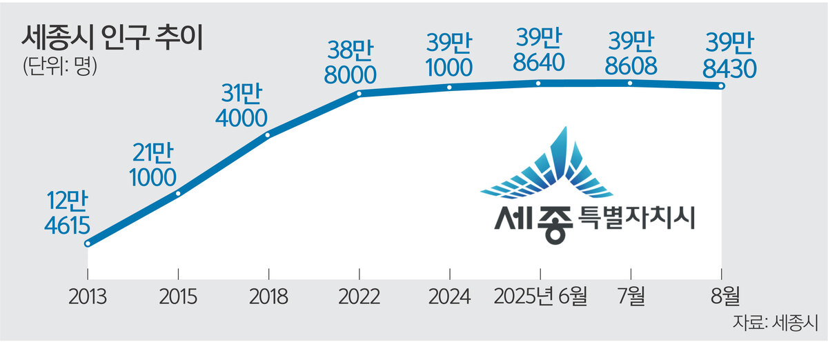 세종시 인구는 행정수도 건립과 지역균형발전의 상징이라는 정부 정책 기조에 따라 중앙부처와 공공기관이 속속 이전하면서 폭발적으로 늘었다. 출범 이듬해인 2013년 12만4615명에서 2022년 38만8927명으로 10년 만에 3배 넘게 수직 상승했다. 20만명(2015년)과 30만명(2018년)을 넘어서는 데 불과 2∼3년씩 걸렸을 뿐이다.
