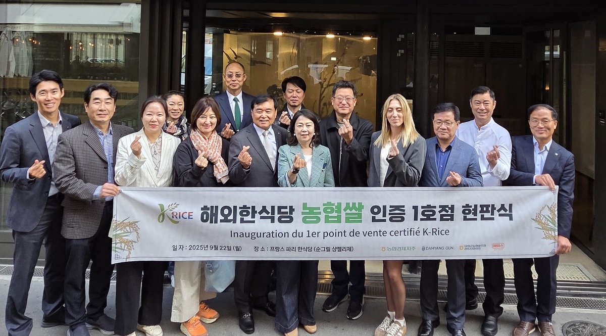 농협(회장 강호동) 경제지주(농업경제대표이사 박서홍)는 지난 22일(현지시간) 프랑스 파리 한식당‘순 그릴 샹젤리제*’에서「해외 한식당 농협쌀 인증제」1호점 현판식을 개최했다.