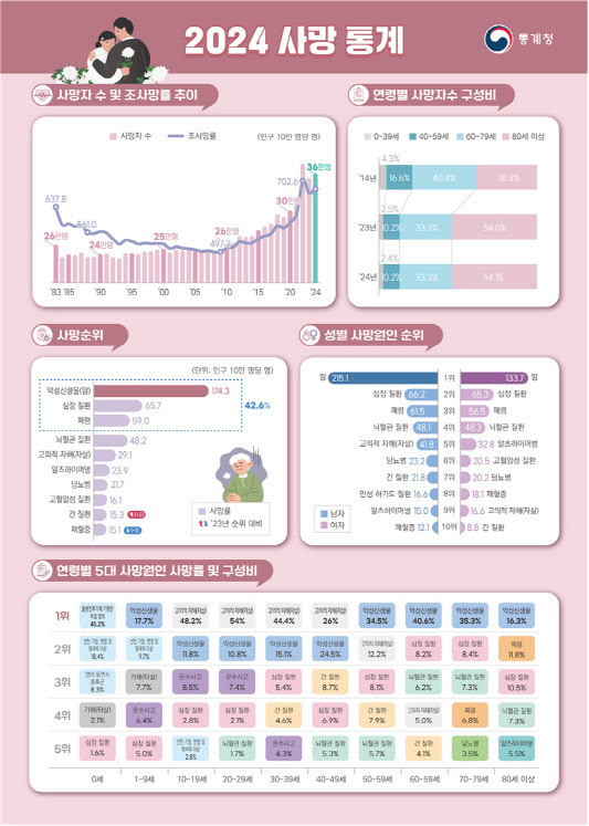 전체 사망자 수는 35만8569명으로 전년보다 6058명(1.7%) 증가했다. 고령화 영향으로 80세 이상 사망자가 전체의 절반(54.1%)을 넘었으며, 이는 10년 전보다 15.3%포인트 늘어난 수치다. 반면 10대 이하와 20대 사망자는 감소했다.