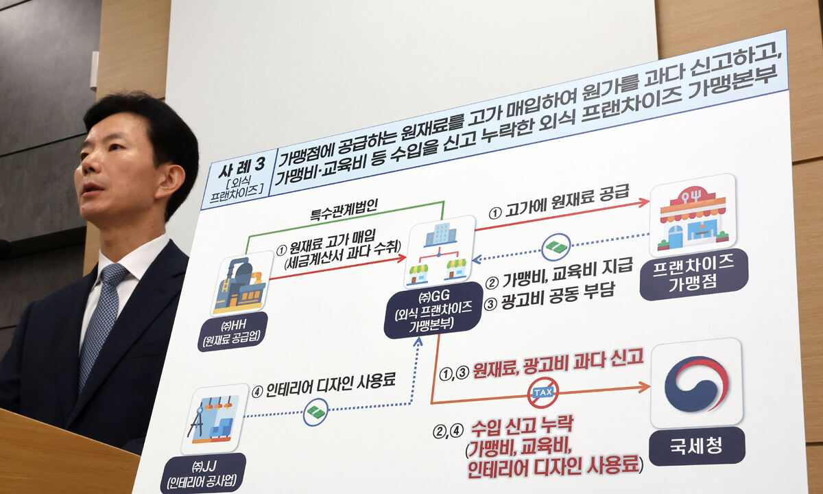 1000개 안팎의 가맹점을 보유한 대형 외식 프랜차이즈 업체들도 식자재 매입가를 부풀리거나 가맹비 매출을 신고 누락했다. 커피·음료 프랜차이즈 가맹본부 C사의 경우 상품 가격을 두 자릿수로 올렸는데, 특수관계법인인 원재료 공급업체로부터 원재료를 고가에 매입하고, 시가보다 높은 가격에 상품을 가맹점에 공급했다. 또 개업하는 가맹점으로부터 가맹비와 교육비를 받으면서 매출 세금계산서를 발급하지 않는 수법으로 매출을 누락하기도 했다.
