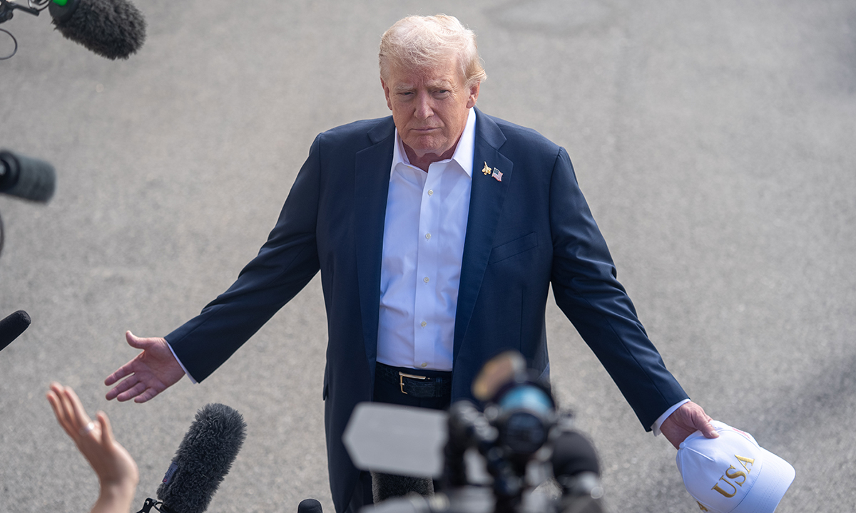 도널드 트럼프 미국 대통령이 26일(현지시간) 워싱턴 백악관에서 출발하기 전 기자들과 문답하고 있다. 트럼프 대통령이 다음달부터 외국에서 수입되는 의약품과 대형 트럭, 주방 및 욕실 가구 등에 대해 관세 부과를 예고하면서 대미 수출을 하는 한국의 관련 업계가 파장을 주시하고 있다.