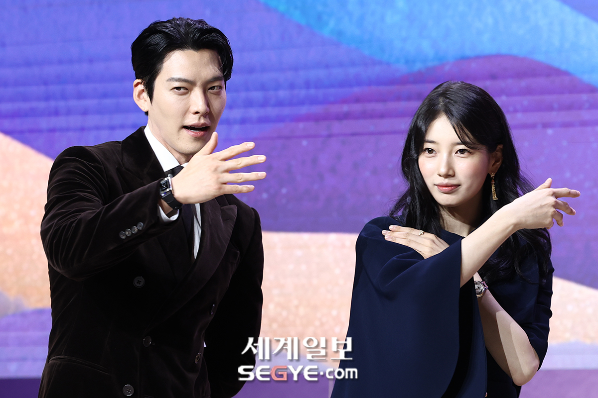 배우 김우빈(사진 왼쪽)과 수지가 29일 조선 팰리스 서울 강남에서 열린 넷플릭스 시리즈 ‘다 이루어질지니’의 제작발표회에 참석해 포즈를 취하고 있다.