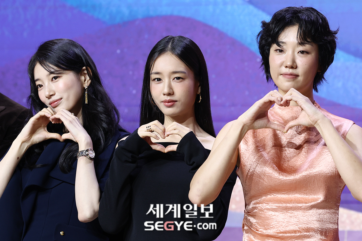 배우 수지, 안은진, 이주영(사진 왼쪽)이 29일 조선 팰리스 서울 강남에서 열린 넷플릭스 시리즈 ‘다 이루어질지니’의 제작발표회에 참석해 포즈를 취하고 있다.
