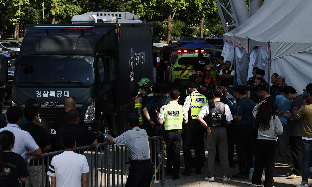 8월 10일 폭발물 설치 신고가 접수된 서울 올림픽공원 KSPO돔(올림픽체조경기장)에서 경찰특공대 및 소방 관계자들이 주변을 살피고 있다. 연합뉴스