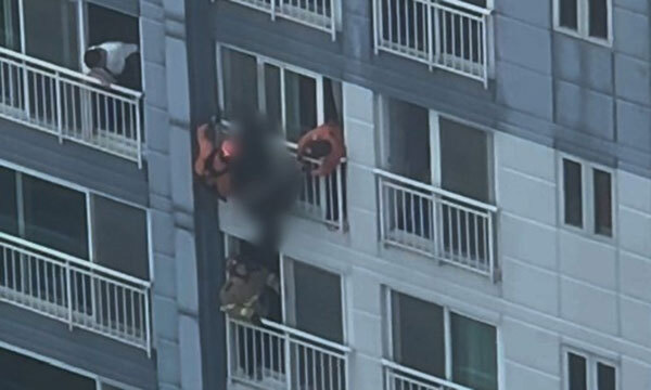 이어 로프를 탄 대원 1명이 23층 난간으로 하강해 외부에서 A씨를 난간에 고정했다. 23층 집 안으로 들어간 대원들도 A씨를 붙잡아 추락을 막았다.