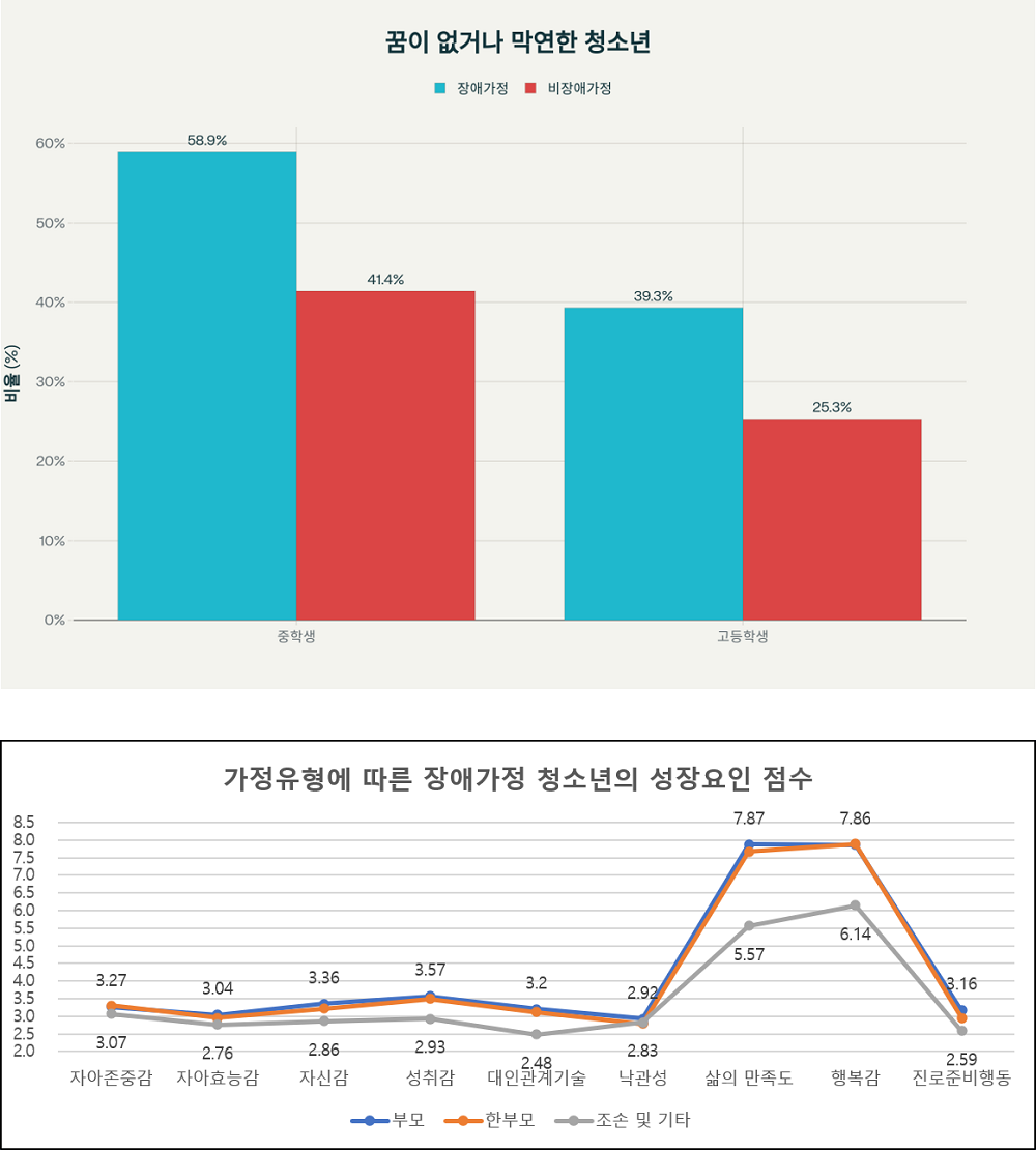 조사 결과, 청소년의 진로 준비에 중요한 요소 중 하나인 ‘장래 희망’과 관련해 장애가정 청소년 중 중학생의 58.9%, 고등학생의 39.3%가 ‘장래 희망이나 꿈이 없거나 막연하다’고 응답했다. 이는 2022년 월드비전 조사에서 나타난 중학생 41.4%, 고등학생 25.3%와 비교했을 때, 장애가정 청소년이 장래 희망(꿈)이 없는 비율이 상대적으로 높다는 것을 보여준다.