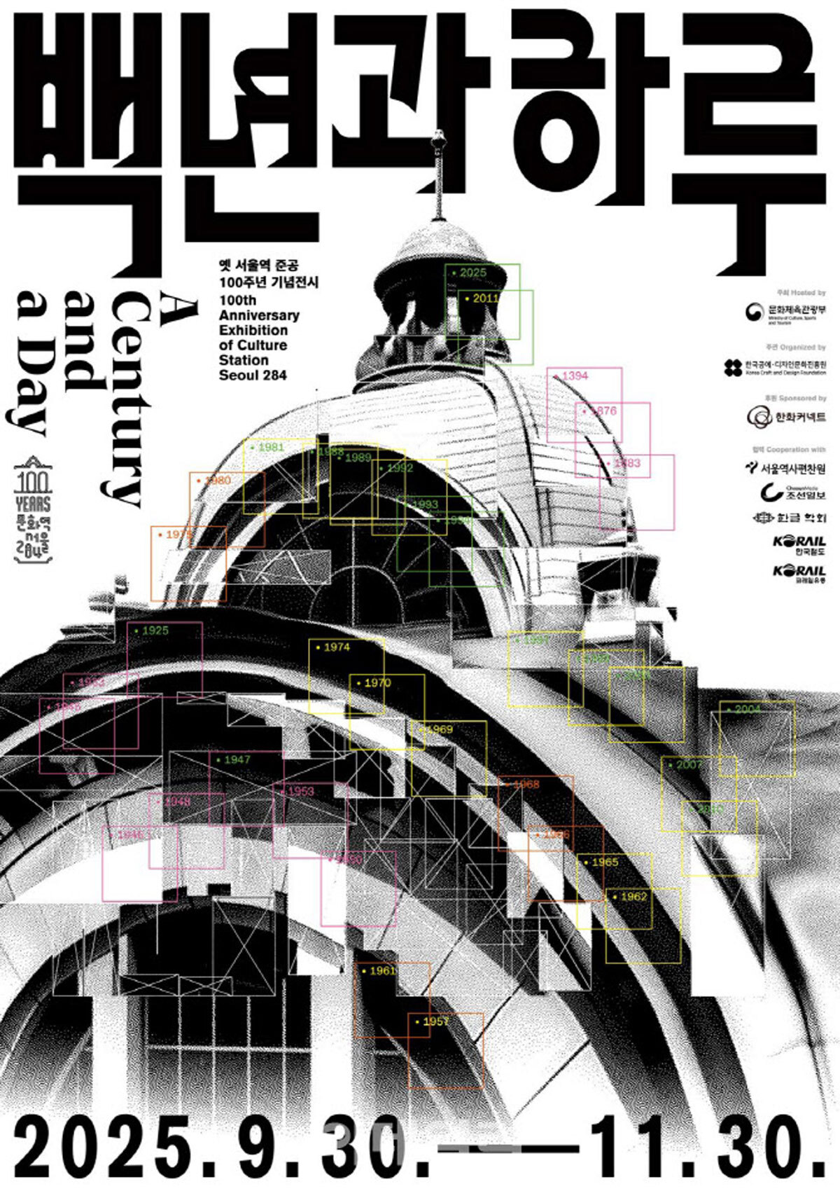 문화체육관광부는 옛 서울역사 준공 100주년을 기념해 11월30일까지 문화역서울284 전관과 커넥트플레이스 서울역점 야외 공간에서 특별기획전 ‘백년과 하루: 기억에서 상상으로’(포스터)를 개최한다고 30일 밝혔다.