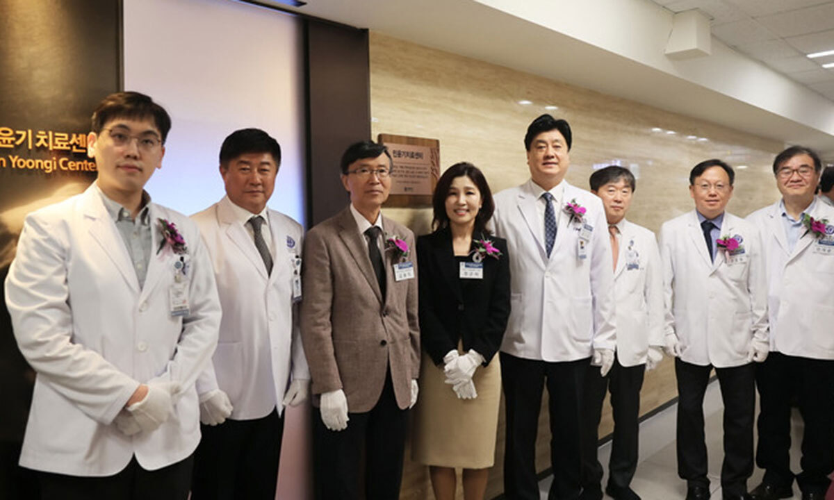 방탄소년단(BTS) 멤버 슈가(본명 민윤기)의 50억원 기부금을 바탕으로 연세 세브란스병원에 30일 문을 연 민윤기치료센터 개소식에서 천근아 소장(왼쪽 네 번째) 등 관계자들이 기념사진을 촬영하고 있다. 민윤기치료센터는 자폐스펙트럼장애 소아·청소년을 위한 전문 치료 시설로 언어·행동치료실과 음악·사회성 집단 치료실을 갖췄다.