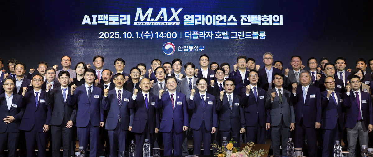 김정관 산업통상자원부 장관을 비롯한 참석자들이 1일 서울 중구 더 플라자 호텔 에서 열린 AI 팩토리 M.AX 얼라이언스 전략회의에서 기념촬영을 하고 있다. 산업통상자원부는 현재 102개인 AI 팩토리 선도사업수를 2030년까지 선도사업 수를 500개 이상으로 확대하며, 내년부터는 완전 자율형 AI 공장인 AI 팩토리의 건설에 필요한 기술개발과 실증사업을 추진할 예정이다.