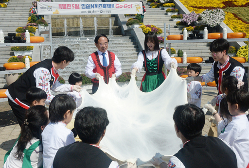 1일 전북 임실군 임실치즈테마파크에서 열린 ‘2025 임실N치즈축제’ 개막 사전행사에서 심민 임실군수(가운데 왼쪽)와 어린이 등이 모짜렐라 치즈를 늘리는 퍼포먼스를 하고 있다. 숙성치즈를 활용한 맛있는 디저트 퐁뒤 체험, 대형 쌀피자 만들기, 숙성치즈 굴리기 등 10개 분야 70여개 프로그램으로 구성된 올해 축제는 8일부터 12일까지 닷새간 열린다.