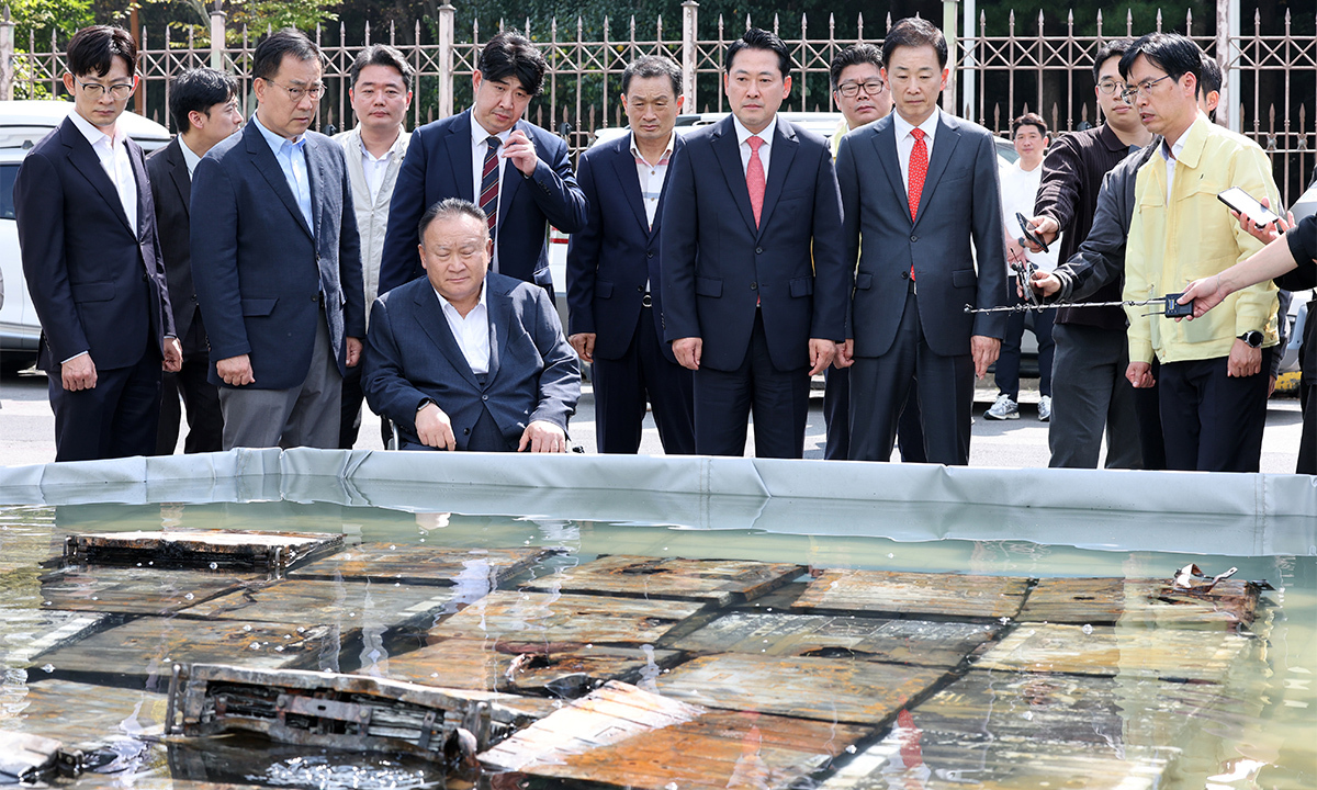 대전 화재현장 찾아간 국힘 국민의힘 장동혁 대표(가운데)가 같은 당 의원들과 1일 오후 대전 국가정보자원관리원 화재 현장을 방문해 화재 원인이었던 리튬이온 배터리 앞에서 피해 상황을 듣고 있다. 뉴스1
