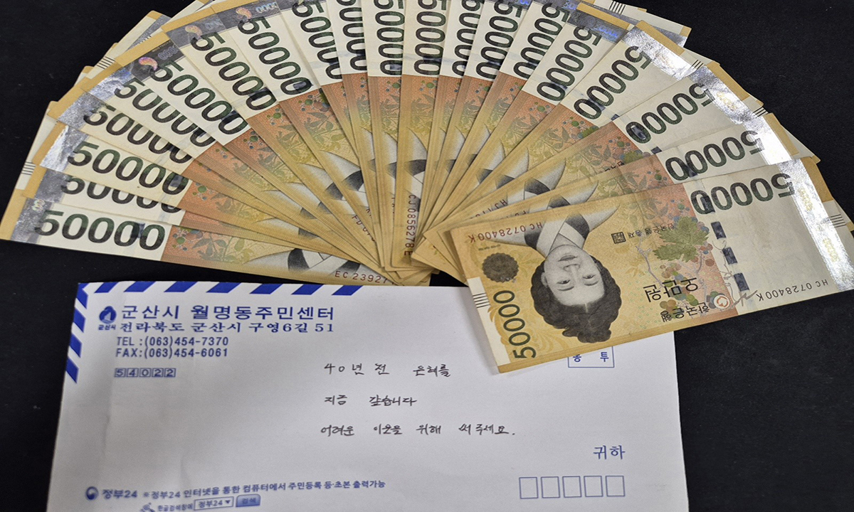 1일 군산 월명동 행정복지센터에 따르면 지난달 말 업무시간이 끝나갈 무렵 60대로 보이는 여성이 홀로 센터를 찾아 비치된 행정 봉투에 뭔가를 적은 뒤 말없이 창구에 내밀었다. 봉투 겉면에는 ‘40년 전 은혜를 지금 갚습니다. 어려운 이웃을 위해 써주세요’라는 글귀가 적혀 있었으며 안에는 5만원권 지폐 20장이 들어 있었다.