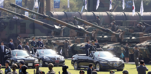 이재명 대통령이 1일 충남 계룡대에서 열린 건군 77주년 국군의날 행사에서 열병 차량에 탑승해 현무-5, 전차 등을 사열하고 있다. 열병식에선 국군이 보유한 무기체계 40여종, 100여대가 등장했다.