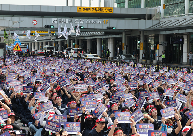 전국공항노동자연대는 이날 오후 2시 김포국제공항 국내선 1층 야외 도로에서 총파업대회를 열고 자회사 직원 불이익 개선과 인력 충원, 4조 2교대 근무 도입 등을 촉구했다.