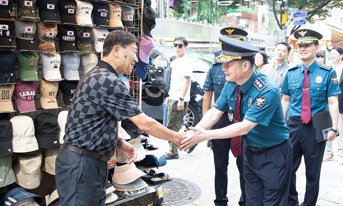 박정보 서울경찰청장(오른쪽)이 추석 연휴를 앞둔 1일 명동 관광특구를 찾아 한 상인과 인사하고 있다. 박 청장은 이 자리에서 명절 치안대책 활동 상황을 점검하고 근무자들에게 관광객 대상 폭행·폭언 등 불법행위에 대한 엄정 대응을 주문했다.