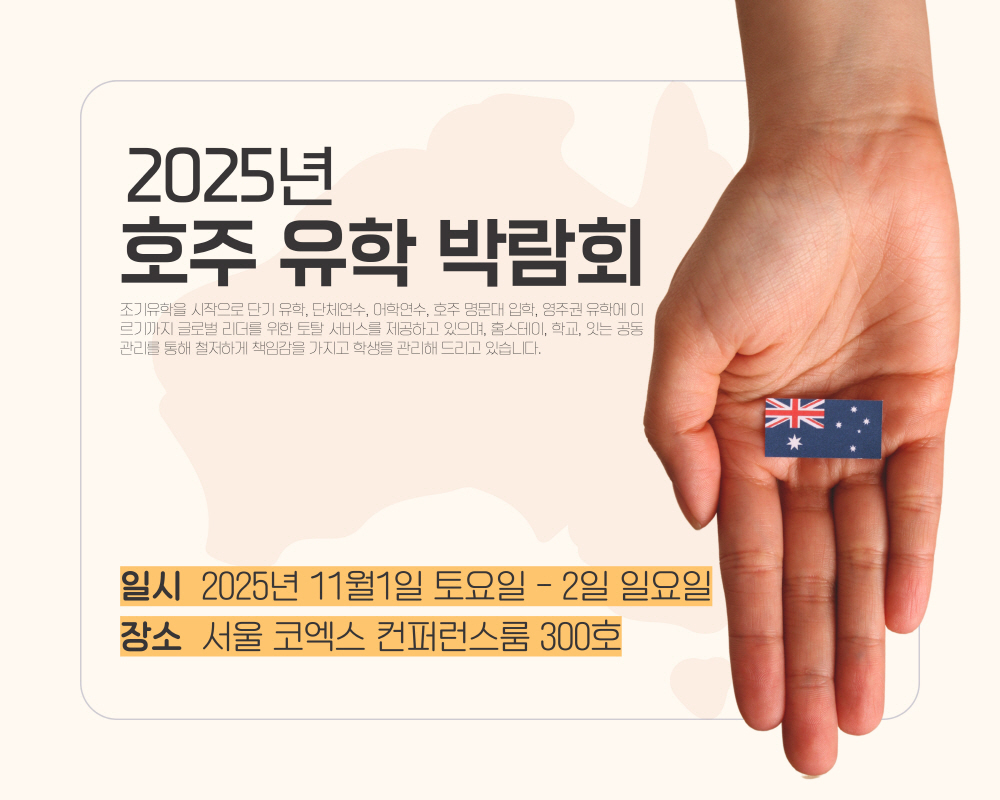 오는 11월 1일(토)과 2일(일), 서울 코엑스 컨퍼런스룸 300호에서 서울 호주 유학박람회가 열린다. 이번 박람회는 호주 대학교와 어학원이 대거 참가하여 호주 어학연수 및 유학 관련 최신 정보를 제공할 예정이다.