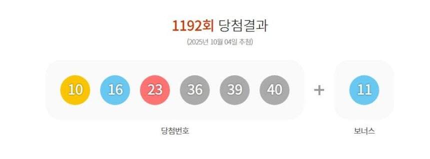 5일 동행복권에 따르면 전날 추첨한 제1192회 로또복권의 1등 당첨번호는 10·16·23·36·39·40이다. 2등 보너스 당첨번호는 11이다.