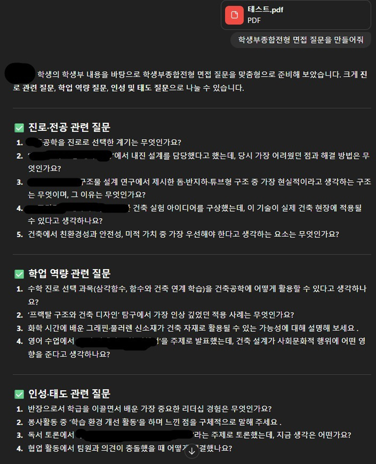 학생부 PDF를 업로드하고 “학종 면접 질문을 만들어 달라”고 요청하면, 진로·학업·인성 영역별 질문이 자동 생성된다. 또 “모의면접 시나리오를 만들어 달라”는 요청을 통해 면접관 질문과 예상 답변 포인트까지 정리해 실제 상황처럼 연습할 수 있다.