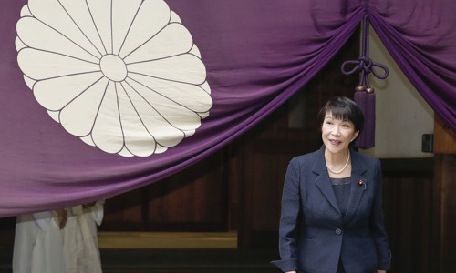 다카이치 총재는 고이즈미 준이치로 전 총리가 2001년 8월 13일 야스쿠니신사를 참배하자 2002년 또 다른 잡지에 쓴 글에서 "당당히 (종전일인 8월) 15일에 참배해야 한다"고 요구했다.