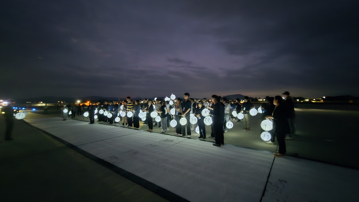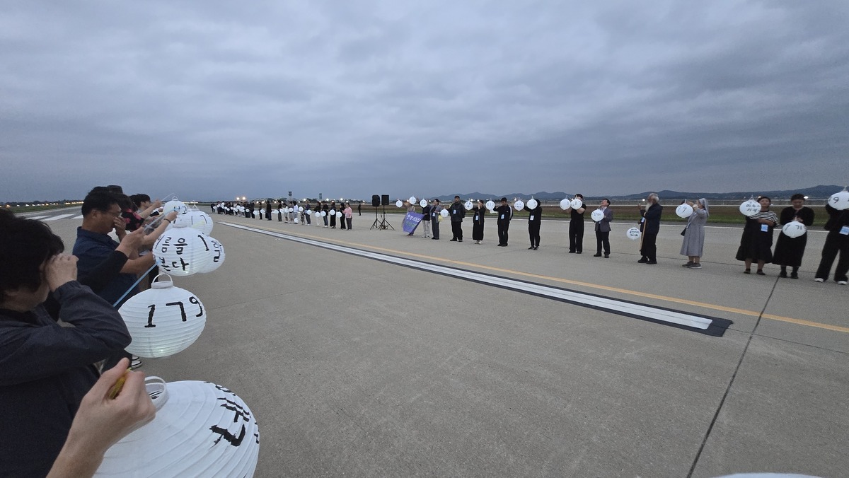 6일 전남 무안군 무안국제공항 활주로에서 유가족과 시민 등이 유등을 들고 희생자를 추모하는 행사를 진행하고 있다. 유가족협의회 제공