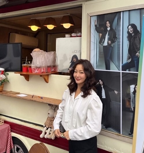 사진 속 김희선은 커피 차량 앞에서 편안한 미소를 지으며 포즈를 취하고 있다.
