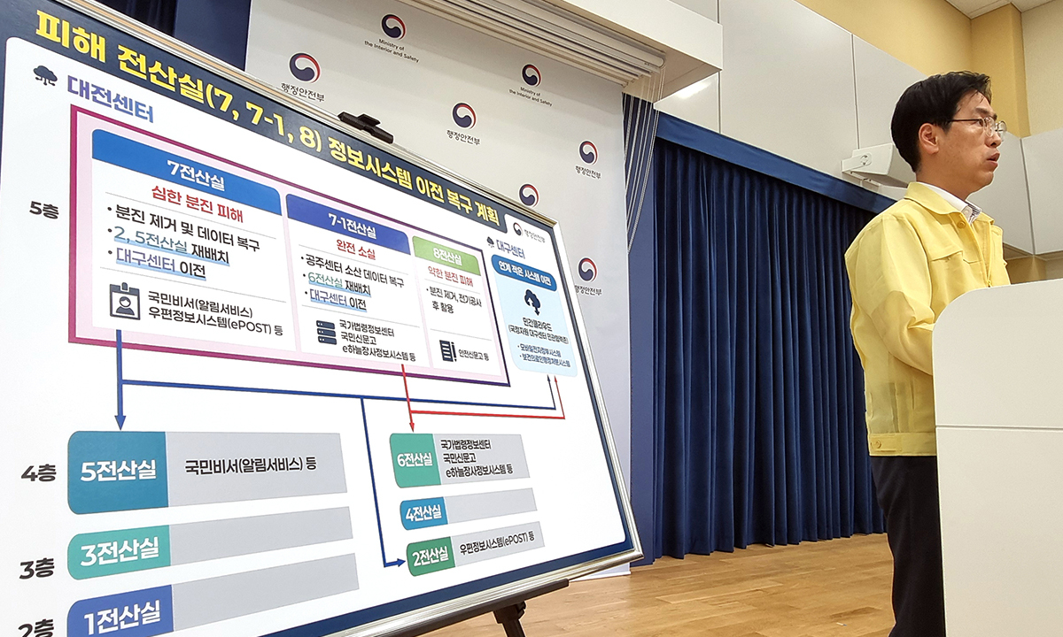 다만 화재 피해가 집중된 5층의 3개 전산실과 연계된 시스템이 많아 복구에 속도를 내지 못하고 있다. 정부는 화재 직후 전체 시스템 정상화에 4주 정도가 걸릴 것이라 공언했는데, 더 많은 시간이 소요될 가능성도 배제할 수 없다. 연휴 중 전산 장비 198식을 신속히 도입해 설치가 끝나는 15일 이후부터는 복구가 빨라질 전망이다. 7전산실과 7-1전산실 시스템 중 일부는 대구 센터로 이전하지 않고 2∼4층의 다른 전산실로 재배치해 복구 속도를 높이기로 했다. 8전산실은 분진이 제거돼 11일 재가동될 예정이다.