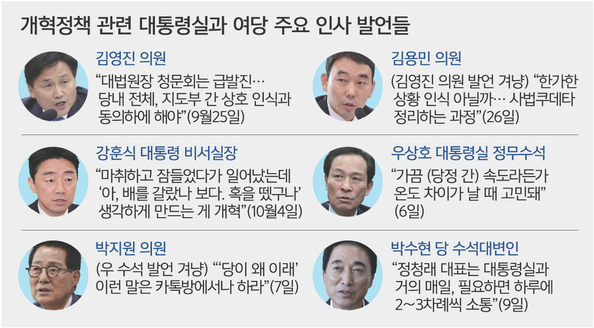 대통령실은 개혁 필요성엔 동의하면서도 일 처리 방식과 속도를 두고 민주당과 이견을 드러냈다. 강훈식 대통령 비서실장은 지난 4일 한 유튜브 채널에서 “불편해하는 사람들도 수술대 위로 살살 꼬셔서, 마취하고 잠들었다가 일어났는데 ‘아 배를 갈랐나 보네. 혹을 뗐구나’ 생각하게 만드는 게 개혁이어야 한다고 대통령은 생각한다”고 설명했다. 강 실장은 “개혁이 그렇게 돼야 저항도 줄고, 저항이 줄어야 성공한다”며 “과거에 우리가 숫자가 많고, 여당이어서 하려고 했던 숱한 과제가 안 된 것을 보면 다 이유가 있는 것 아니냐는 인식을 갖고 있다”고도 전했다.
