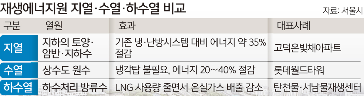 서울지역에 재생열을 활용하는 건물이 점점 늘고 있다. 연료비 부담은 적고 온실가스 배출도 낮아 친환경·경제성을 동시에 갖출 수 있어서다. 서울시는 지열뿐 아니라 상수도를 냉·난방 열원으로 활용하는 수열, 하수 방류수를 활용하는 하수열에도 주목하고 있다. 2030년까지 신재생에너지 보급용량을 3GW까지 늘릴 계획이다.
