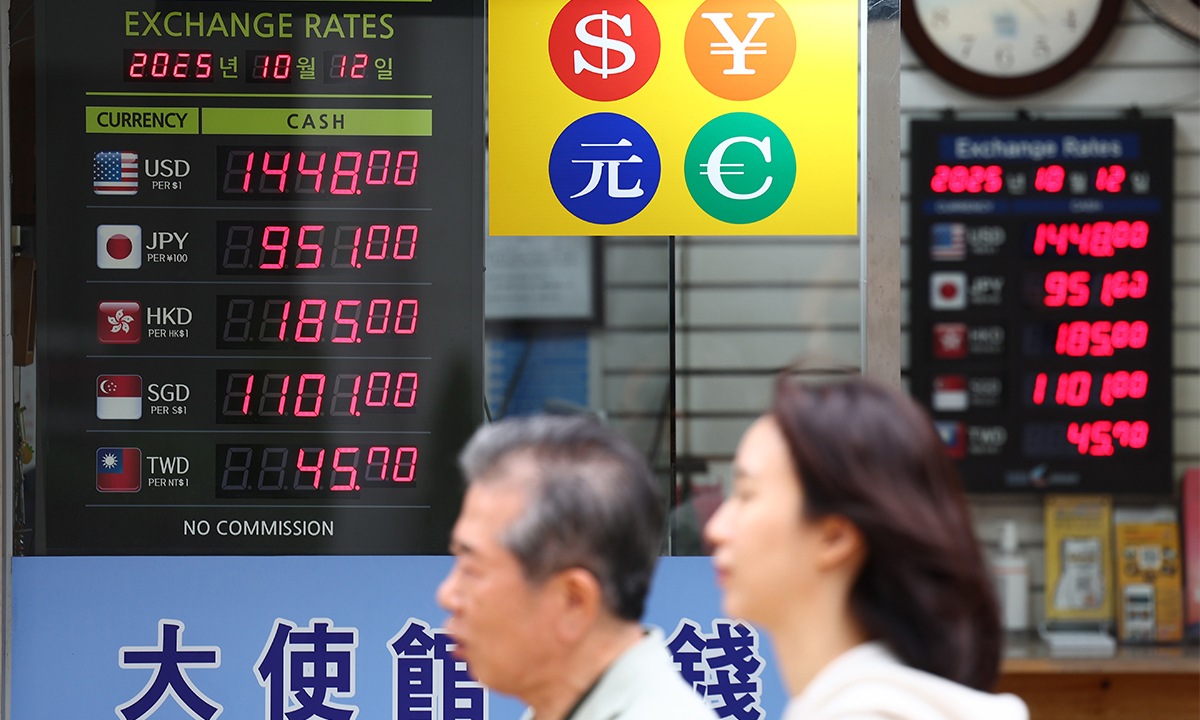 12일 서울 시내 한 사설환전소에 달러 살 때 가격이 1448.0원으로 표시돼 있다. 원·달러 환율은 도널드 트럼프 미국 대통령의 대중 관세 강화 위협 등의 영향을 받아 전날 야간 거래에서 장중 1432.0원까지 치솟았다.