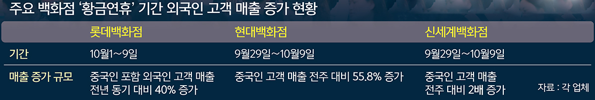 현대백화점과 신세계백화점은 지난달 29일부터 이달 9일까지 중국인 고객 매출이 전주 대비 각각 55.8%, 50% 증가했다. 현대백화점은 국경절 연휴에 맞춰 외국인 대상으로 대대적인 할인 프로모션 및 체험 콘텐츠를 선보였다. 대표적으로 중국 최대 결제사인 유니언페이를 비롯해 은련카드, 위챗페이 등과 협업해 구매 금액대별로 최대 15%의 사은 혜택을 제공했다.