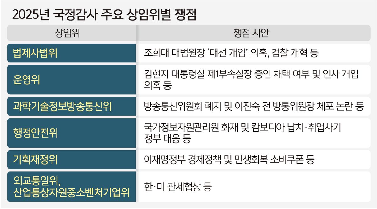 또한 한·미 관세협상 교착을 두고도 외통위와 산업통상자원중소벤처기업위원회에서 날선 공방이 이어질 예정이다. 기획재정위원회는 이재명정부의 경제정책과 민생회복 소비쿠폰 발급이 야당의 공세 지점으로 꼽힌다.