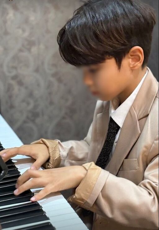 사진 속 준재 군은 단정한 정장 차림으로 피아노 건반 위에 손을 올리고 진지한 표정으로 연주에 몰두한 모습이다.