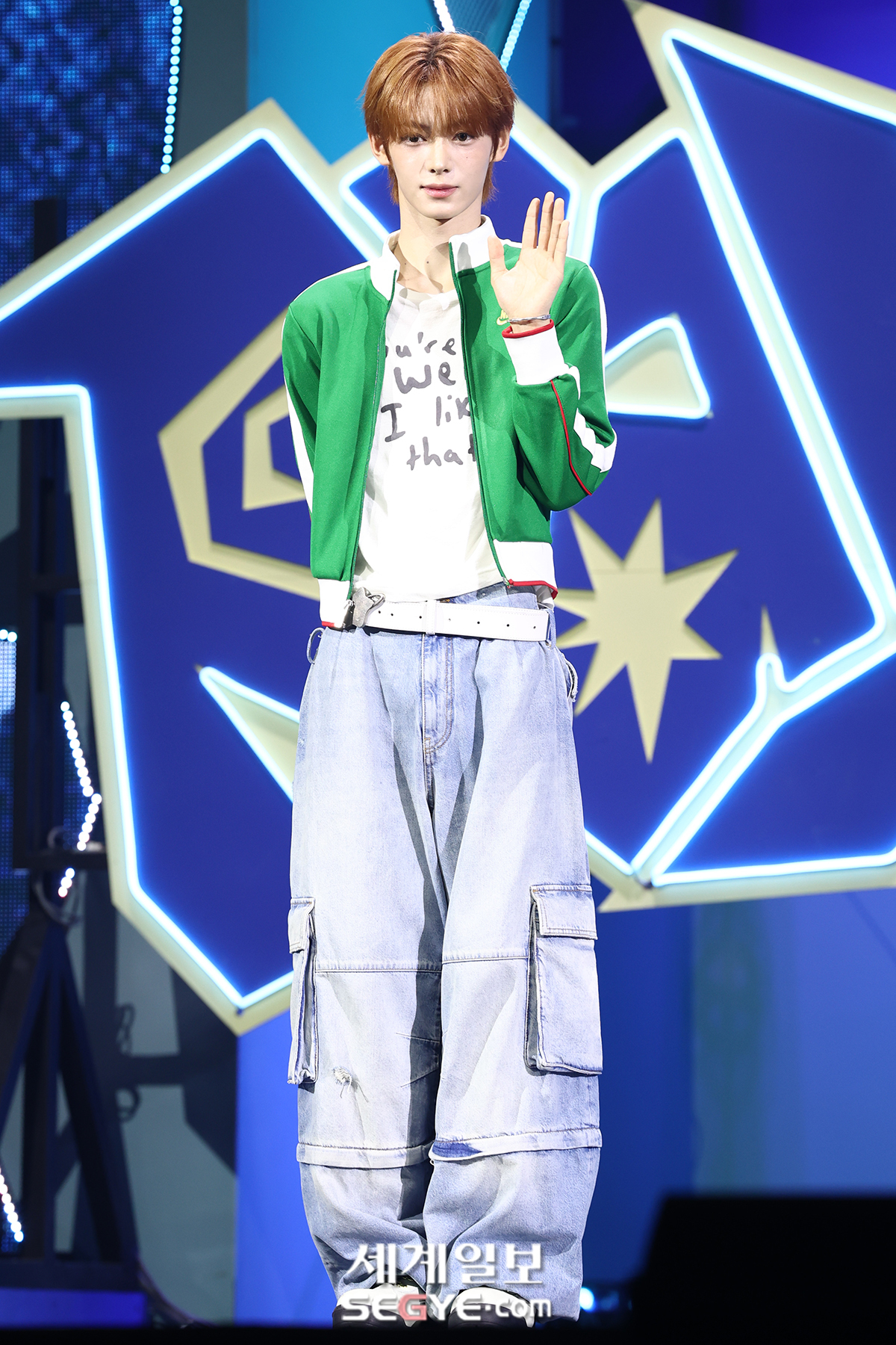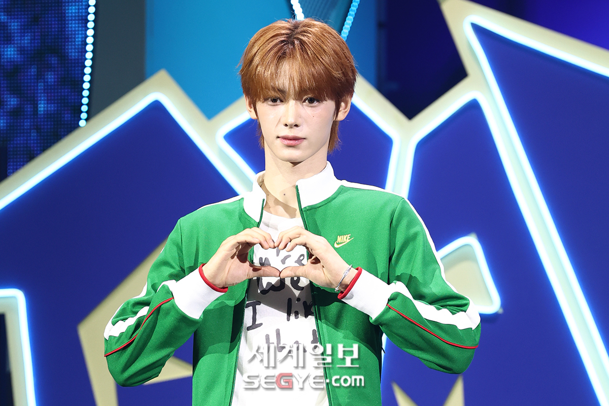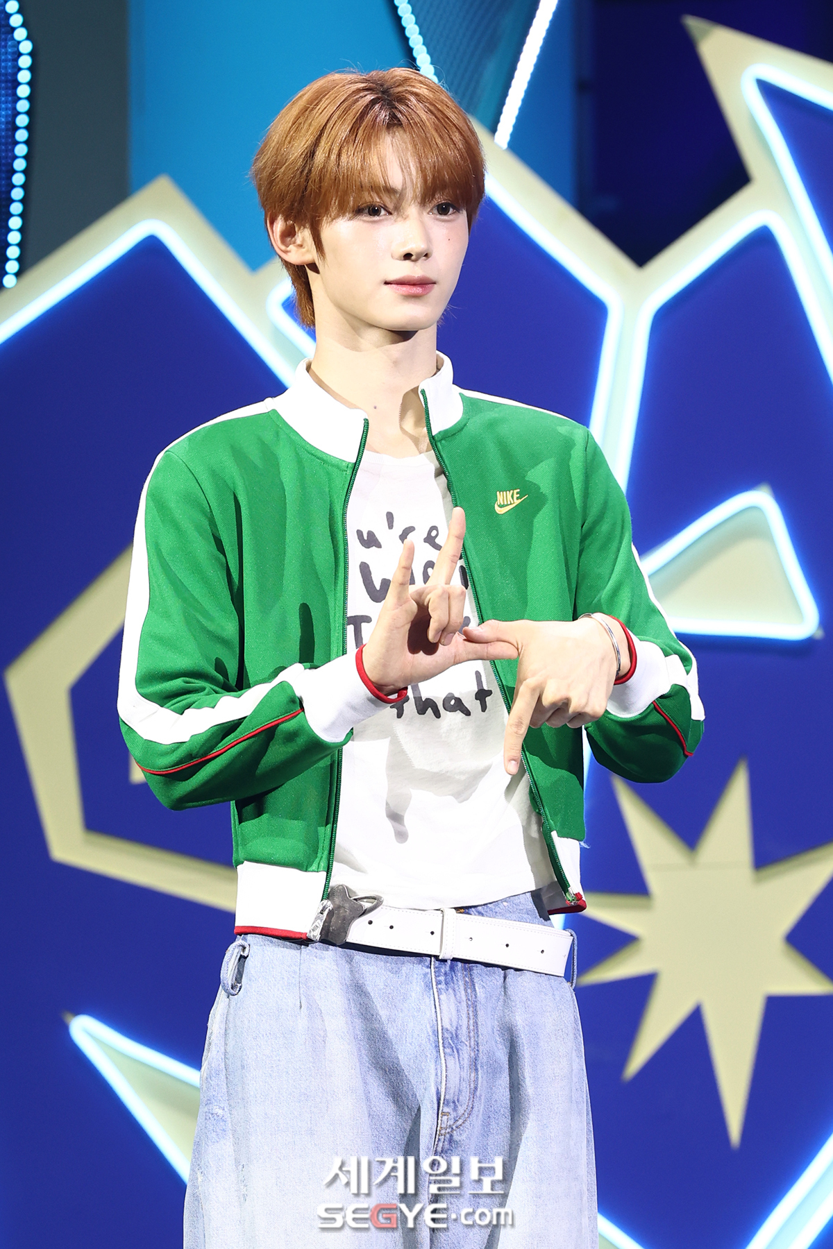 그룹 투어스 한진이 13일 서울 광진구 광장동 예스24 라이브홀에서 열린 미니 4집 ‘play hard’(플레이 하드)의 쇼케이스에 참석해 포즈를 취하고 있다.