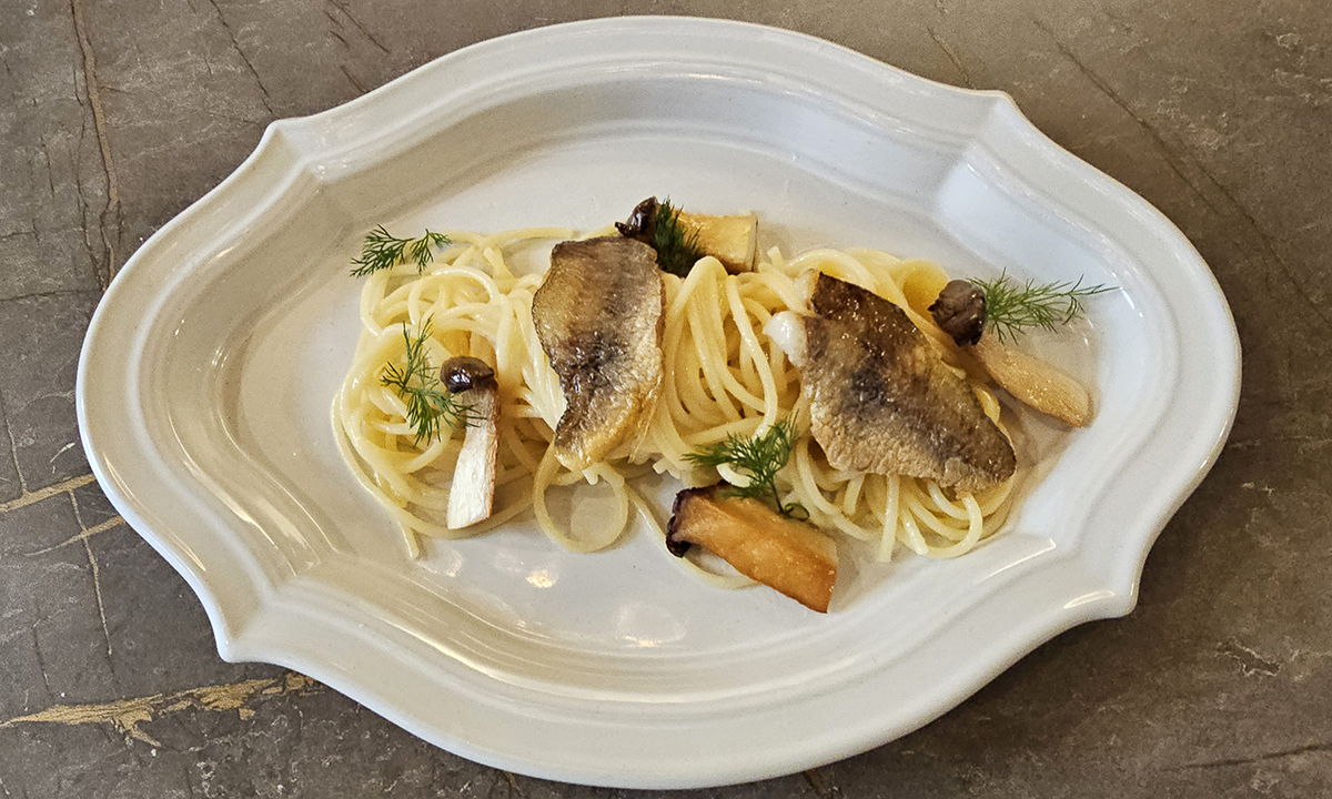 <재료> 조기살 100g, 다진 안초비 5g, 삶은 스파게티면 150g, 그라나 파다노 치즈 10g, 마늘 2톨, 간마늘 1작은술, 면수 150mL, 버터 1큰술, 엑스트라 버진 올리브오일 15mL, 다진 파슬리 약간, 후추 약간.