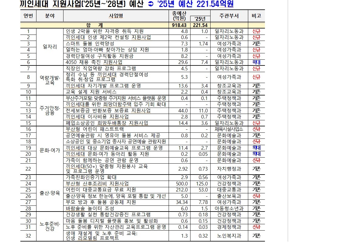 시는 또 내년에 3개 지원사업을 추가해 ‘끼인세대’ 지원 폭을 넓힐 계획이다. 특히 40대 임신·출산 증가에 따른 안전하고 건강한 출산을 지원하는 ‘부산 40+ 산모 행복 패키지 지원사업’을 비롯한 3개 지원사업을 추가 지원한다.