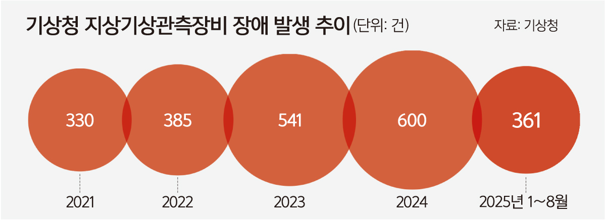 14일 더불어민주당 박홍배 의원실이 기상청으로부터 받은 자료에 따르면 기상청 지상기상관측장비 장애 발생 건수는 2021년 330건, 2022년 385건으로 증가세를 보이더니 2023년 541건에 이어 지난해 600건까지 늘었다. 올해의 경우 1∼8월에 361건 장애가 발생했다.