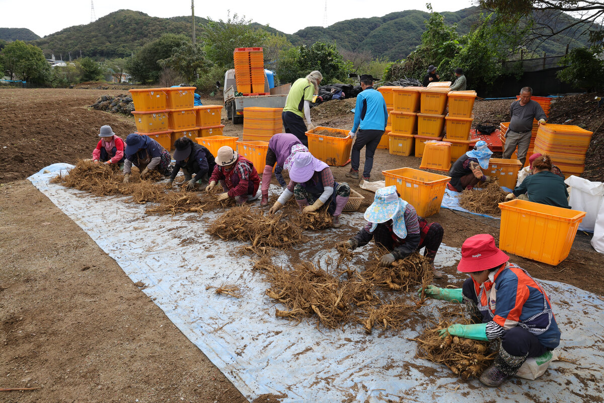 14일 경기 파주시 적성면 접경지역에서 농민들이 6년근 인삼을 수확한 뒤 분류 작업을 하고 있다. 파주시는 18∼19일 임진각에서 제20회 파주개성인삼축제를 개최한다.