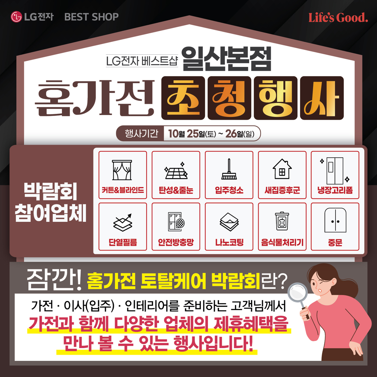 프리미엄 가전매장 LG전자 베스트샵 일산본점이 오는 10월 25일(토)~26일(일)까지 단 이틀간만 대규모 홈가전 토탈케어 초청행사를 준비했다고 밝혔다.